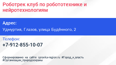 Роботрек, клуб по робототехнике и нейротехнологиям по адресу Удмуртия, Глазов, улица Будённого, 2 в дальнейшем Организация, размещена в следующих категориях: