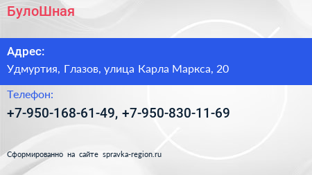 БулоШная по адресу Удмуртия, Глазов, улица Карла Маркса, 20 в дальнейшем Организация, размещена в следующих категориях: