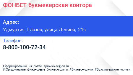 ФОНБЕТ, букмекерская контора по адресу Удмуртия, Глазов, улица Ленина, 21в в дальнейшем Организация, размещена в следующих категориях: