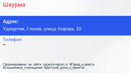 Шаурма по адресу Удмуртия, Глазов, улица Кирова, 10 в дальнейшем Организация, размещена в следующих категориях:
