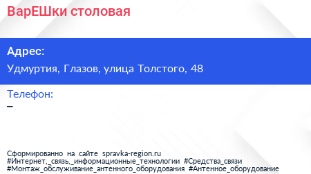 ВарЕШки, столовая по адресу Удмуртия, Глазов, улица Толстого, 48 в дальнейшем Организация, размещена в следующих категориях: