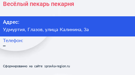 Весёлый пекарь, пекарня по адресу Удмуртия, Глазов, улица Калинина, 3а в дальнейшем Организация, размещена в следующих категориях: