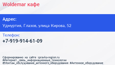 Woldemar, кафе по адресу Удмуртия, Глазов, улица Кирова, 52 в дальнейшем Организация, размещена в следующих категориях: