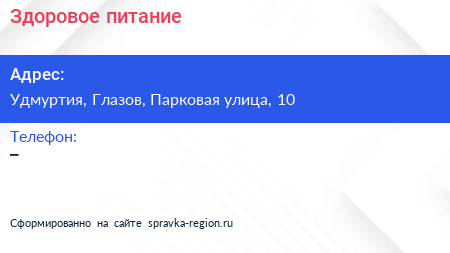 Здоровое питание по адресу Удмуртия, Глазов, Парковая улица, 10 в дальнейшем Организация, размещена в следующих категориях: