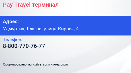 Pay.Travel, терминал по адресу Удмуртия, Глазов, улица Кирова, 4 в дальнейшем Организация, размещена в следующих категориях: