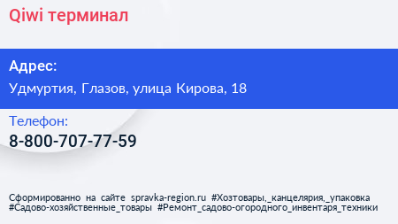Qiwi, терминал по адресу Удмуртия, Глазов, улица Кирова, 18 в дальнейшем Организация, размещена в следующих категориях: