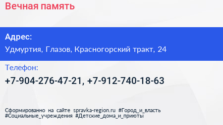Вечная память по адресу Удмуртия, Глазов, Красногорский тракт, 24 в дальнейшем Организация, размещена в следующих категориях: