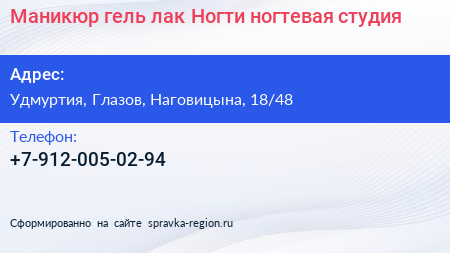 Маникюр гель-лак Ногти, ногтевая студия по адресу Удмуртия, Глазов, Наговицына, 18/48 в дальнейшем Организация, размещена в следующих категориях: