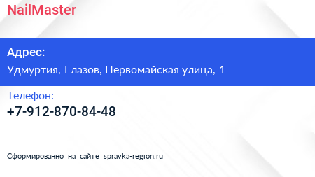 NailMaster по адресу Удмуртия, Глазов, Первомайская улица, 1 в дальнейшем Организация, размещена в следующих категориях: