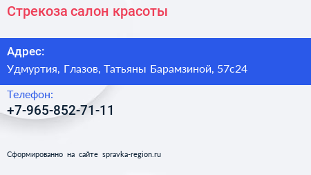Стрекоза, салон красоты по адресу Удмуртия, Глазов, Татьяны Барамзиной, 57с24 в дальнейшем Организация, размещена в следующих категориях: