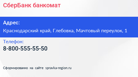 СберБанк, банкомат по адресу Краснодарский край, Глебовка, Мачтовый переулок, 1 в дальнейшем Организация, размещена в следующих категориях: