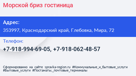 Морской бриз, гостиница по адресу 353997, Краснодарский край, Глебовка, Мира, 72 в дальнейшем Организация, размещена в следующих категориях: