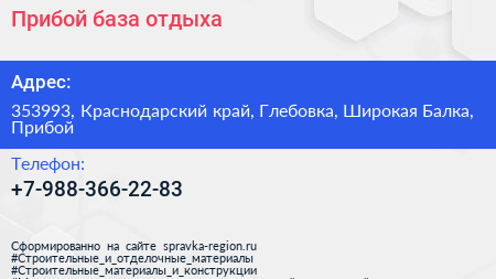 Прибой, база отдыха по адресу 353993, Краснодарский край, Глебовка, Широкая Балка, Прибой в дальнейшем Организация, размещена в следующих категориях: