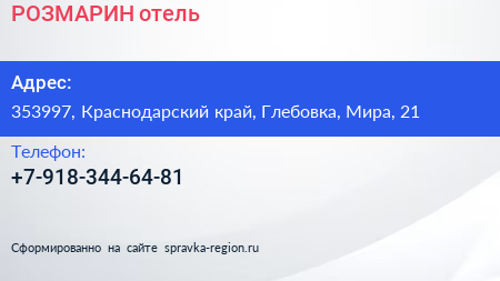РОЗМАРИН, отель по адресу 353997, Краснодарский край, Глебовка, Мира, 21 в дальнейшем Организация, размещена в следующих категориях: