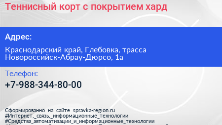 Теннисный корт с покрытием хард по адресу Краснодарский край, Глебовка, трасса Новороссийск-Абрау-Дюрсо, 1а в дальнейшем Организация, размещена в следующих категориях: