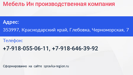 Мебель-Ин, производственная компания по адресу 353997, Краснодарский край, Глебовка, Черноморская, 7 в дальнейшем Организация, размещена в следующих категориях: