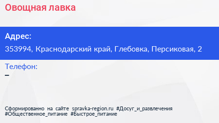 Овощная лавка по адресу 353994, Краснодарский край, Глебовка, Персиковая, 2 в дальнейшем Организация, размещена в следующих категориях: