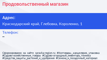 Продовольственный магазин по адресу Краснодарский край, Глебовка, Короленко, 1 в дальнейшем Организация, размещена в следующих категориях: