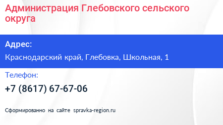 Администрация Глебовского сельского округа по адресу Краснодарский край, Глебовка, Школьная, 1 в дальнейшем Организация, размещена в следующих категориях: