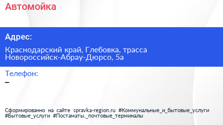 Автомойка по адресу Краснодарский край, Глебовка, трасса Новороссийск-Абрау-Дюрсо, 5а в дальнейшем Организация, размещена в следующих категориях: