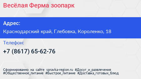 Весёлая Ферма, зоопарк по адресу Краснодарский край, Глебовка, Короленко, 18 в дальнейшем Организация, размещена в следующих категориях: