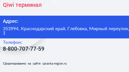 Qiwi, терминал по адресу 353994, Краснодарский край, Глебовка, Мирный переулок, 1 в дальнейшем Организация, размещена в следующих категориях: