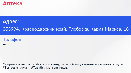 Аптека по адресу 353994, Краснодарский край, Глебовка, Карла Маркса, 18 в дальнейшем Организация, размещена в следующих категориях: