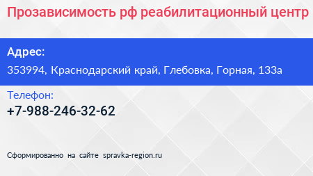 Прозависимость.рф, реабилитационный центр по адресу 353994, Краснодарский край, Глебовка, Горная, 133а в дальнейшем Организация, размещена в следующих категориях: