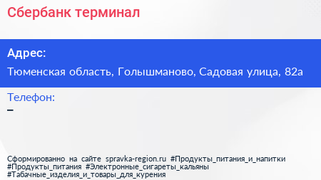 Сбербанк, терминал по адресу Тюменская область, Голышманово, Садовая улица, 82а в дальнейшем Организация, размещена в следующих категориях: