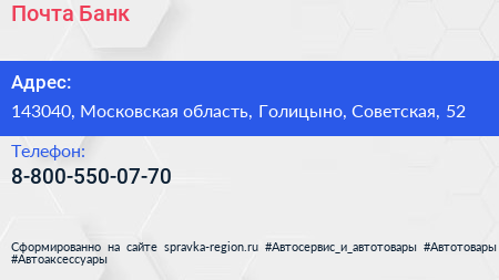 Почта Банк по адресу 143040, Московская область, Голицыно, Советская, 52 в дальнейшем Организация, размещена в следующих категориях: