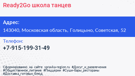 Ready2Go, школа танцев по адресу 143040, Московская область, Голицыно, Советская, 52 в дальнейшем Организация, размещена в следующих категориях: