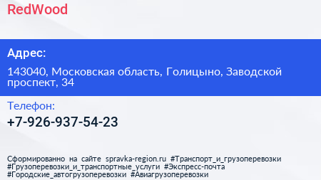 RedWood по адресу 143040, Московская область, Голицыно, Заводской проспект, 34 в дальнейшем Организация, размещена в следующих категориях: