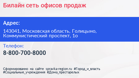 Билайн, сеть офисов продаж по адресу 143041, Московская область, Голицыно, Коммунистический проспект, 1о в дальнейшем Организация, размещена в следующих категориях: