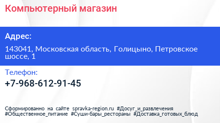 Компьютерный магазин по адресу 143041, Московская область, Голицыно, Петровское шоссе, 1 в дальнейшем Организация, размещена в следующих категориях: