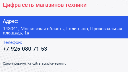 Цифра, сеть магазинов техники по адресу 143041, Московская область, Голицыно, Привокзальная площадь, 1а в дальнейшем Организация, размещена в следующих категориях: