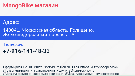 MnogoBike, магазин по адресу 143041, Московская область, Голицыно, Железнодорожный проспект, 9 в дальнейшем Организация, размещена в следующих категориях:
