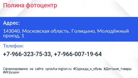 Полина, фотоцентр по адресу 143040, Московская область, Голицыно, Молодёжный проезд, 1 в дальнейшем Организация, размещена в следующих категориях: