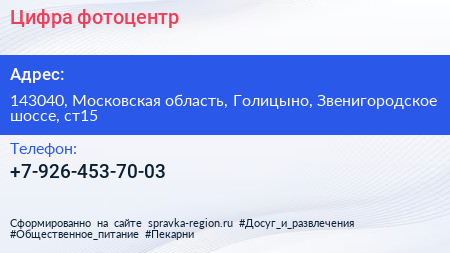 Цифра, фотоцентр по адресу 143040, Московская область, Голицыно, Звенигородское шоссе, ст15 в дальнейшем Организация, размещена в следующих категориях: