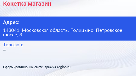 Кокетка, магазин по адресу 143041, Московская область, Голицыно, Петровское шоссе, 8 в дальнейшем Организация, размещена в следующих категориях: