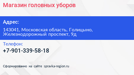 Магазин головных уборов по адресу 143041, Московская область, Голицыно, Железнодорожный проспект, 9д в дальнейшем Организация, размещена в следующих категориях: