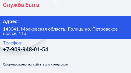 Для связи с организацией воспользуйтесь номером телефона: +7-909-948-01-54. Ежедневно с 10:00 до 18:00. по предварительному звонку: пн-вс, вы можете обратиться в эту организацию.
