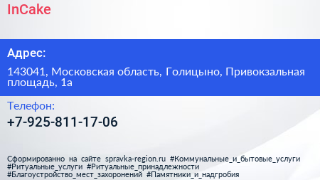 InCake по адресу 143041, Московская область, Голицыно, Привокзальная площадь, 1а в дальнейшем Организация, размещена в следующих категориях: