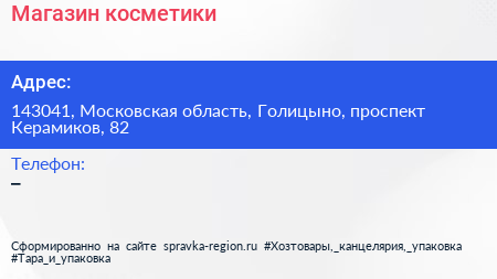 Магазин косметики по адресу 143041, Московская область, Голицыно, проспект Керамиков, 82 в дальнейшем Организация, размещена в следующих категориях: