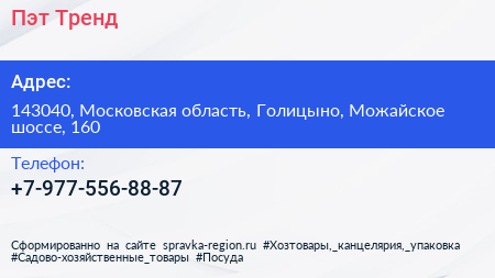 Пэт-Тренд по адресу 143040, Московская область, Голицыно, Можайское шоссе, 160 в дальнейшем Организация, размещена в следующих категориях: