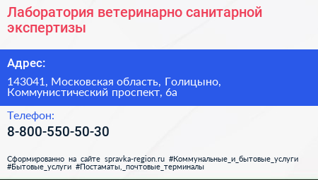 Лаборатория ветеринарно-санитарной экспертизы по адресу 143041, Московская область, Голицыно, Коммунистический проспект, 6а в дальнейшем Организация, размещена в следующих категориях: