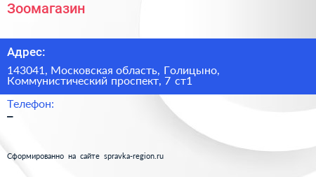 Зоомагазин по адресу 143041, Московская область, Голицыно, Коммунистический проспект, 7 ст1 в дальнейшем Организация, размещена в следующих категориях: