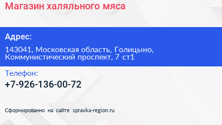 Магазин халяльного мяса по адресу 143041, Московская область, Голицыно, Коммунистический проспект, 7 ст1 в дальнейшем Организация, размещена в следующих категориях: