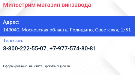 Мильстрим, магазин винзавода по адресу 143040, Московская область, Голицыно, Советская, 1/51 в дальнейшем Организация, размещена в следующих категориях: