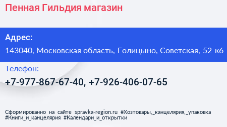 Пенная Гильдия, магазин по адресу 143040, Московская область, Голицыно, Советская, 52 к6 в дальнейшем Организация, размещена в следующих категориях: