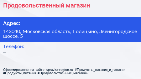 Продовольственный магазин по адресу 143040, Московская область, Голицыно, Звенигородское шоссе, 5 в дальнейшем Организация, размещена в следующих категориях: